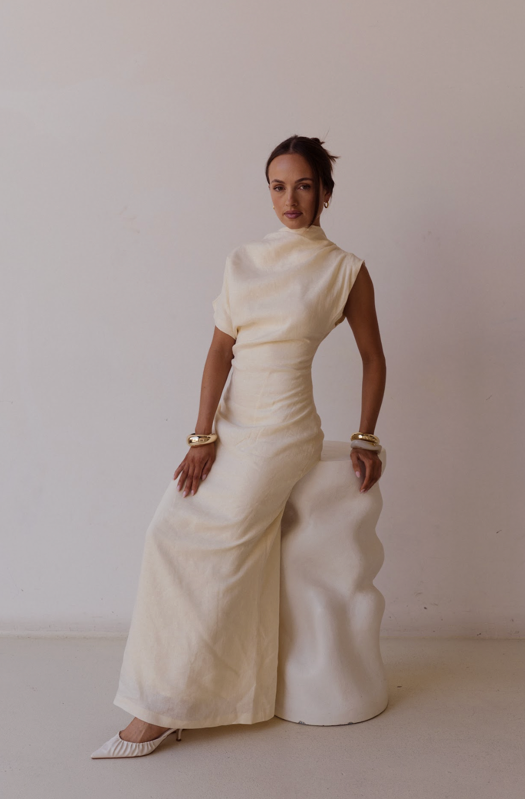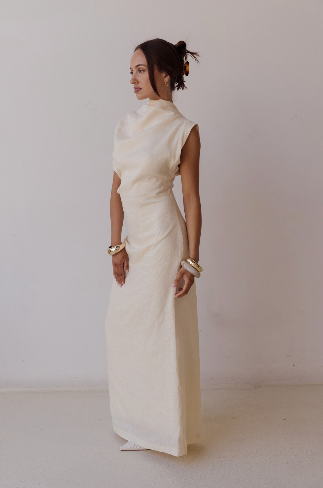 The Velour Dress is a sleek maxi featuring a high neckline and striking asymmetric sleeve - one cap sleeve and one extended sleeve - for a modern, architectural edge. With distinctive cinched side detailing that sculpts a flattering silhouette, its figure-hugging fit and luxurious drape transition effortlessly from boardroom to evening soirée.
