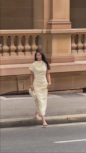 The Velour Dress is a sleek maxi featuring a high neckline and striking asymmetric sleeve - one cap sleeve and one extended sleeve - for a modern, architectural edge. With distinctive cinched side detailing that sculpts a flattering silhouette, its figure-hugging fit and luxurious drape transition effortlessly from boardroom to evening soirée.
