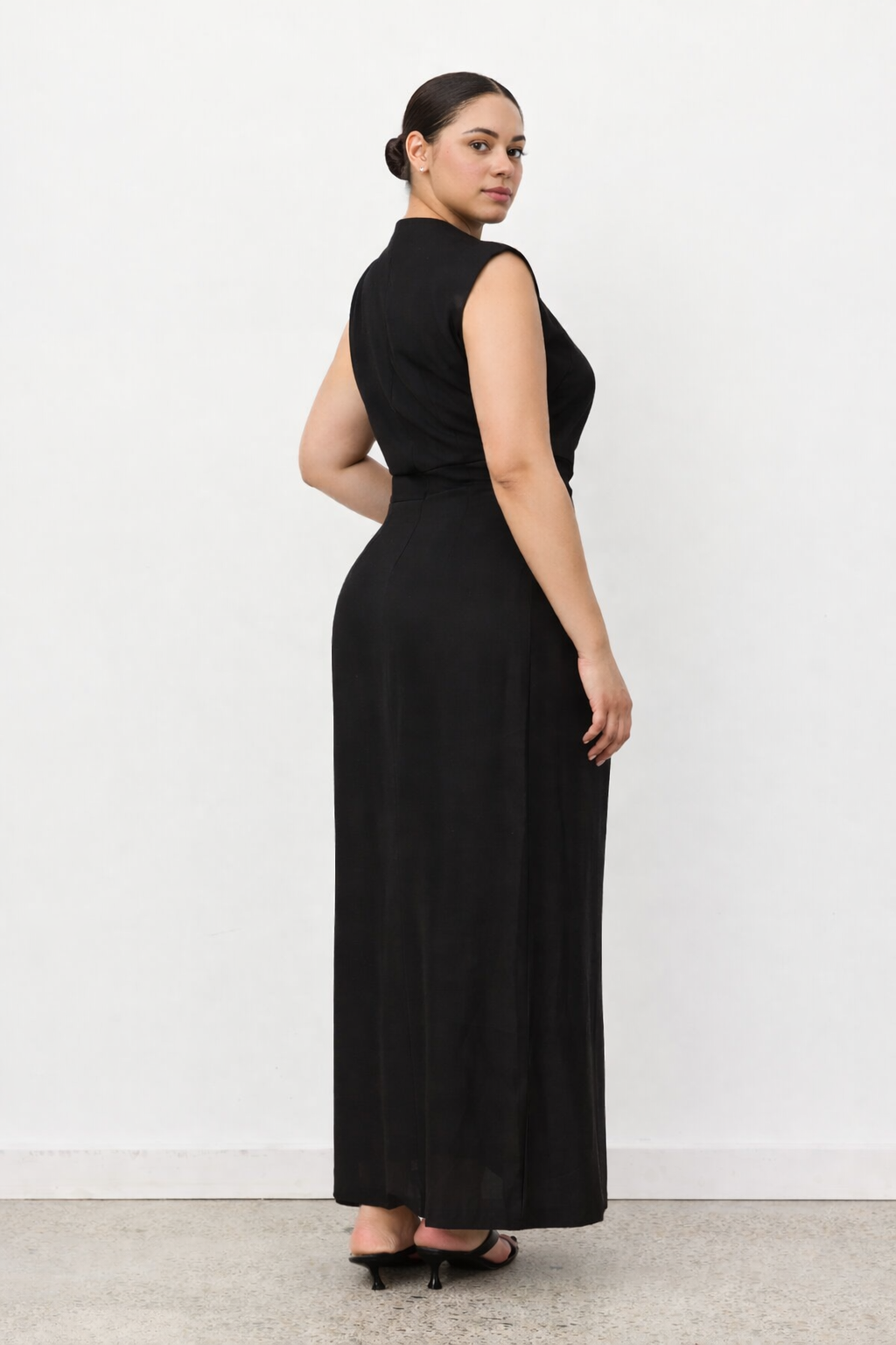 Introducing Velour in Black. Sophisticated elegance redefined. The Velour Dress is a sleek maxi featuring a high neckline and striking asymmetric sleeve - one cap sleeve and one extended sleeve - for a modern, architectural edge. With distinctive cinched side detailing that sculpts a flattering silhouette, its figure-hugging fit and luxurious drape transition effortlessly from boardroom to evening soirée.