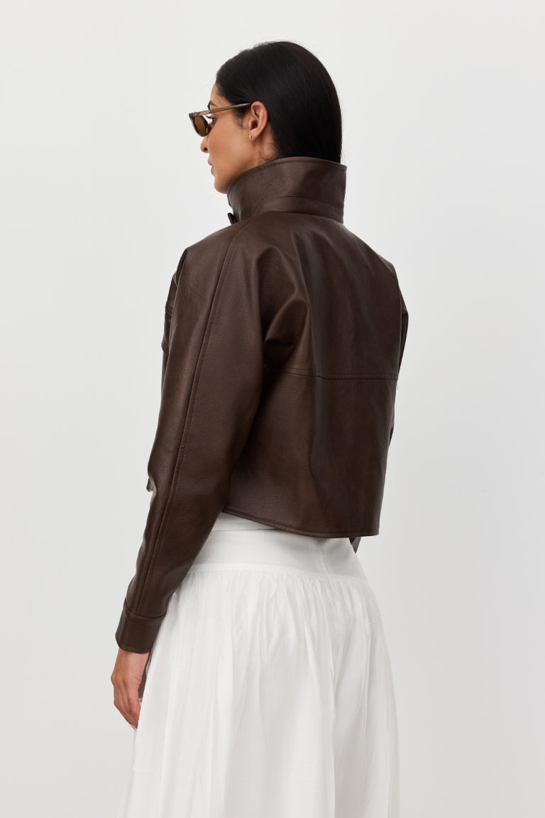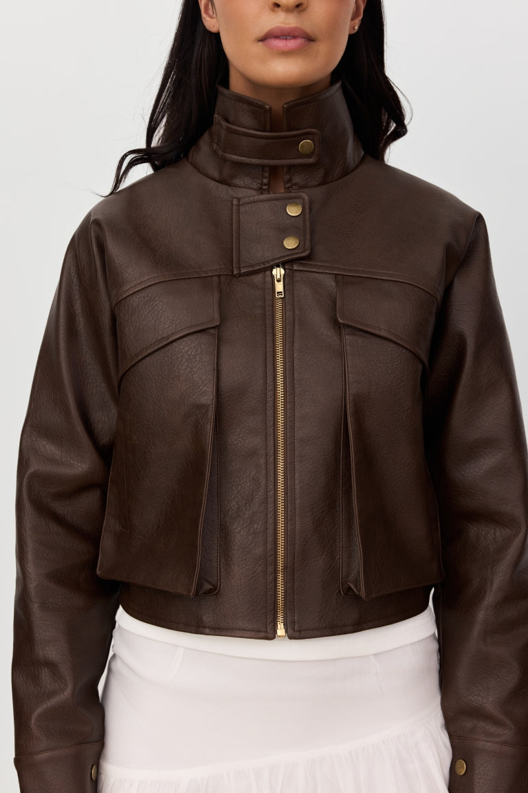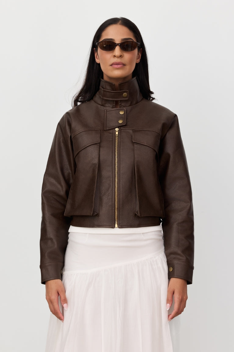 The Keira Leather Jacket is a modern wardrobe essential crafted with structured detailing and timeless appeal. Designed with a clean, cropped silhouette, it features a full zip front, statement gold hardware, and functional front pockets for a refined finish. The versatile collar can be worn up for a more structured look or worn down for effortless, everyday styling.