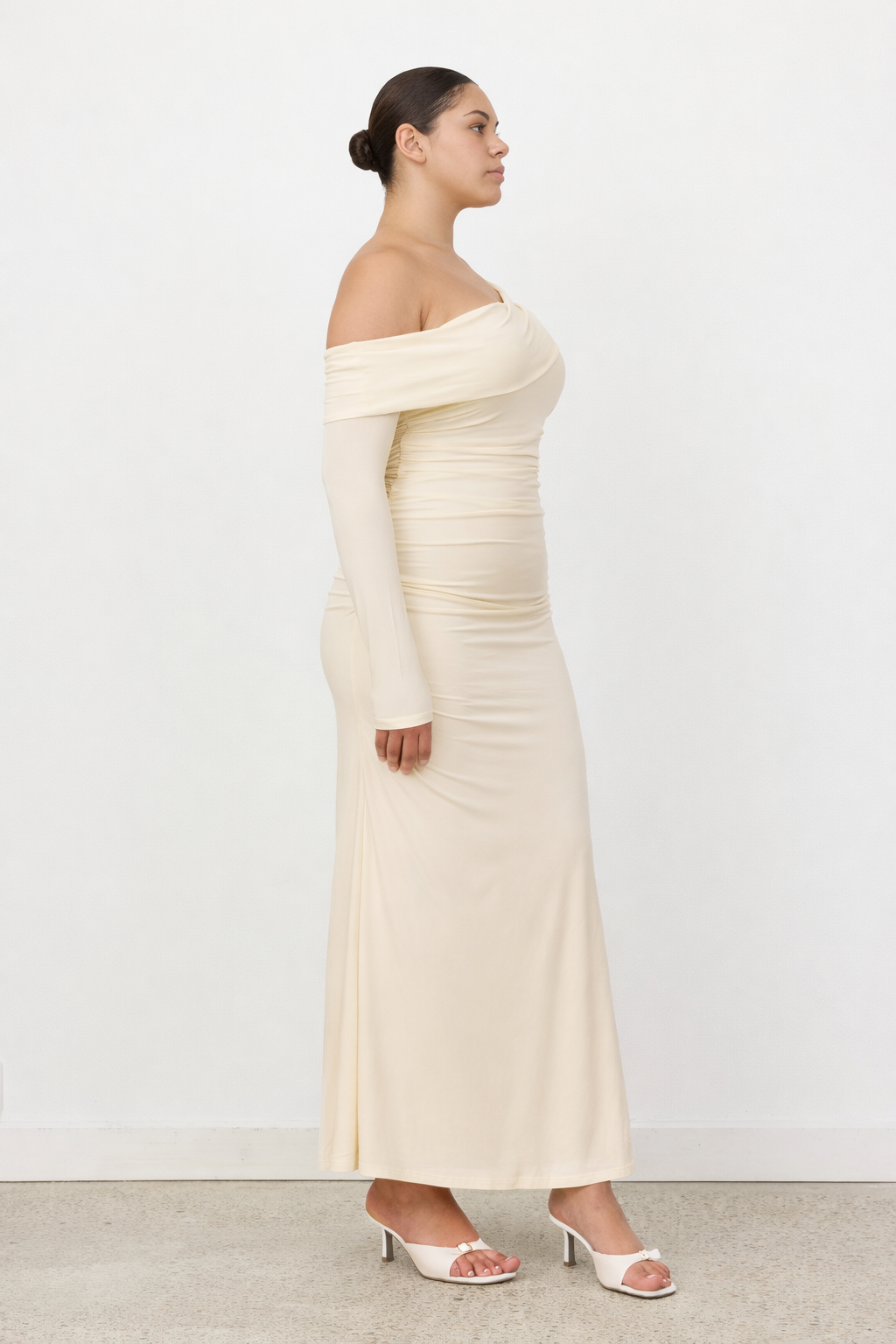 The Estelle Dress is a timeless statement silhouette designed with elegant draping and a softly sculpted fit. Featuring an off the shoulder neckline with a single long sleeve, it is finished with delicate ruching through the waist to flatter the figure. Falling into a clean, elongated maxi length, Estelle offers a refined balance of structure and fluidity.