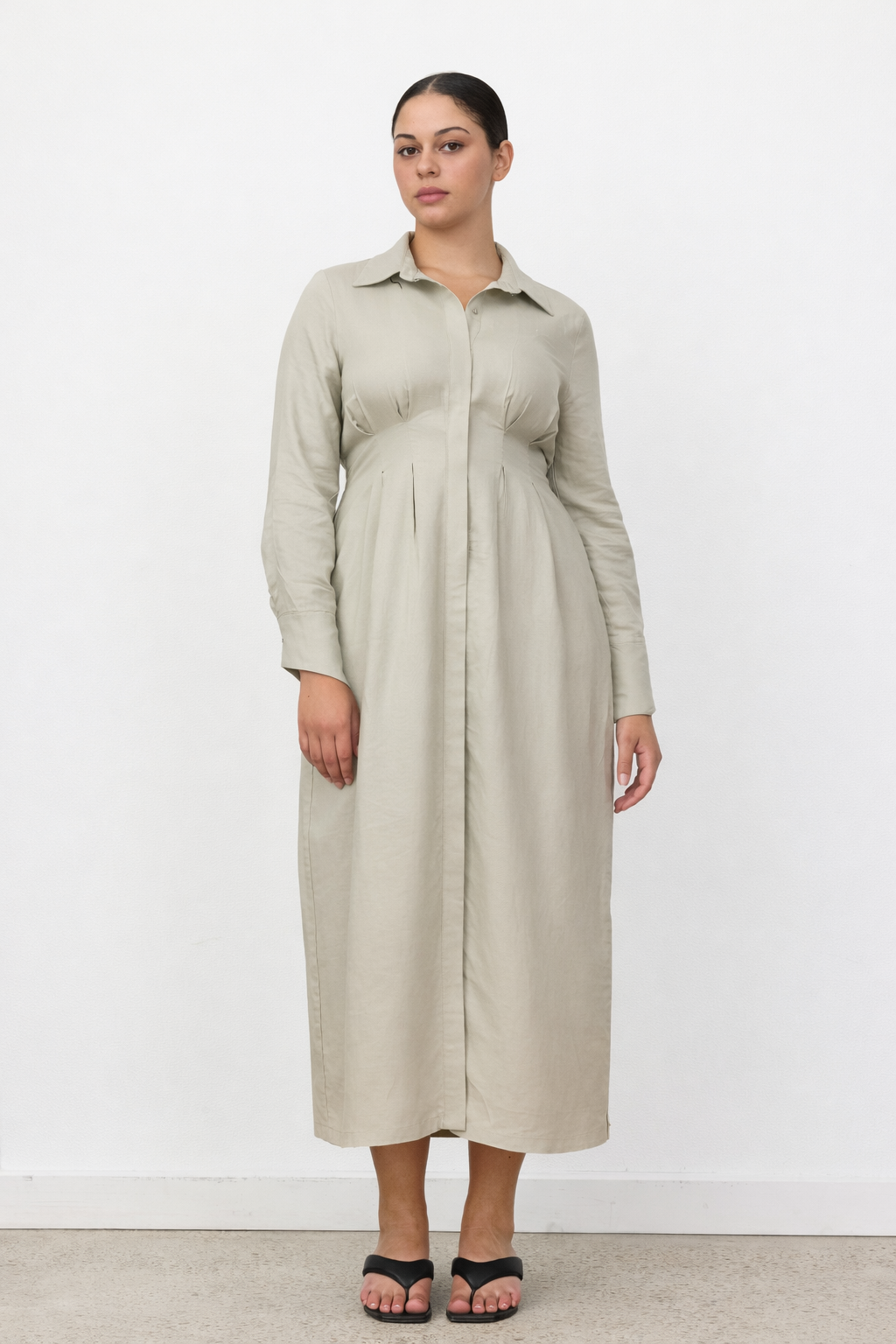 The Florence Dress is a timeless linen blend maxi designed with considered structure and elevated detailing. Fully lined for comfort and coverage, it features subtle waist shaping to flatter the silhouette and falls into a clean, elongated maxi length for effortless wear. The long sleeves are finished with refined cuff detailing, while a statement silver top button and matching silver sleeve buttons add a polished, modern finish.