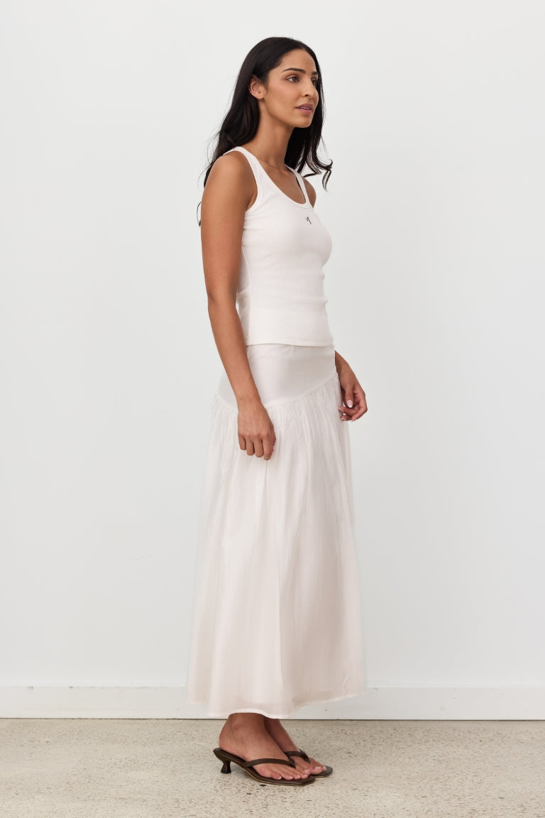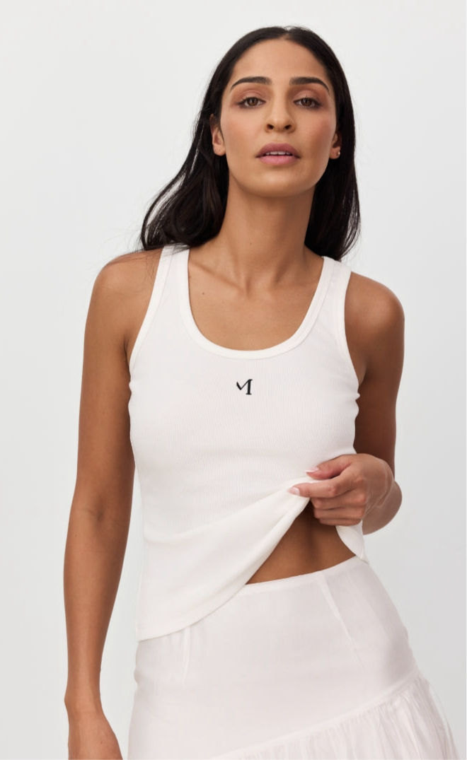 The MODI Tank is a refined everyday essential designed for effortless wear. Crafted from a soft, ribbed fabrication, it features a classic scoop neckline and a flattering, close to body fit. Finished with a subtle black logo at the chest, this timeless piece balances simplicity with a clean, modern finish